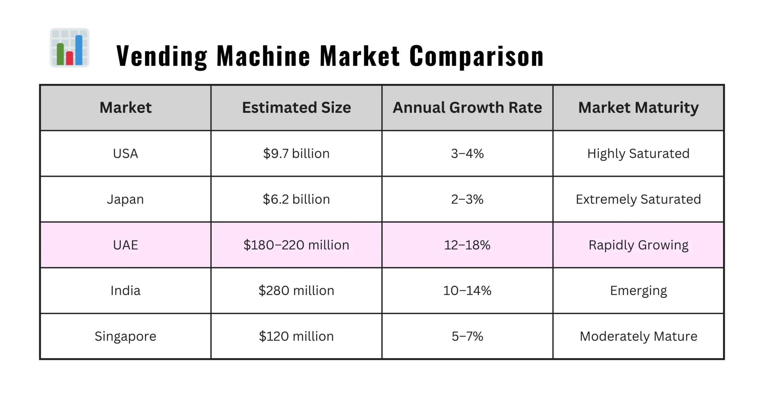 As the UAE builds more infrastructure, the demand for vending machines will grow rapidly, making it a highly scalable and future-ready market.